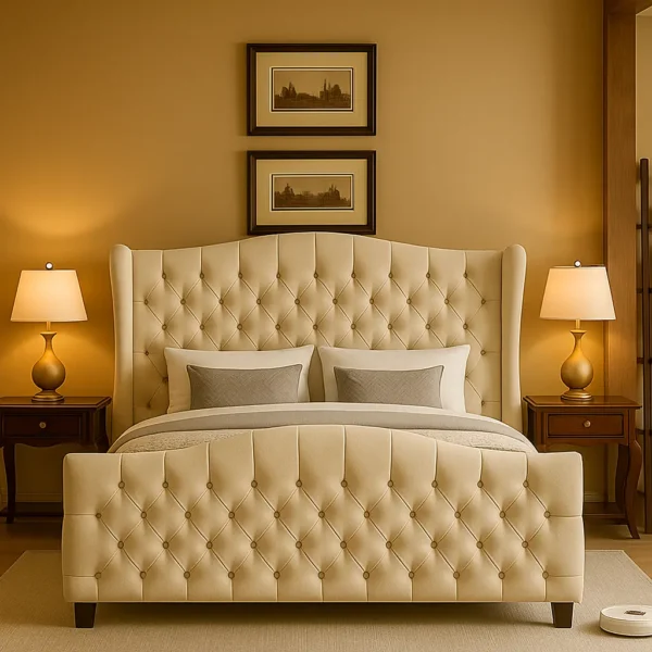 of a classic winged headboard. Its flared, piped wings